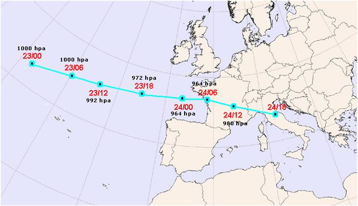 The 2009 Klaus winter storm (00 UTC 23 January to 18 UTC 24 January) has been one of those cyclones that visit us not so often, leaving a serious path of damage behind it, especially in northern Spain and southern France. Reaching explosive development rates as high as 34 mb in 24 hours, and registered maximum surface wind gusts of the order of 200 km/h. Klaus cyclone, as a system with a clear surface pressure signal, approximately started on day 23 about 00 UTC, in the middle of the Atlantic, at position shown below, with a minimum MSLP value of 1000 mb, according to ECMWF / HIRLAM analysis. The track of the cyclone was purely zonal and its speed was markedly high, reaching values above 100 km/h. A minimum surface pressure of about 964 mb at cyclone center took place on day 24 at about 00 UTC, more or less maintained for several hours during the warm seclusion phase of the system. Below, an approximate track of the center of the cyclone, labeled with passing dates, UTC times and minimum MSLP's analyzed by HIRLAM-AEMET numerical model, is presented.