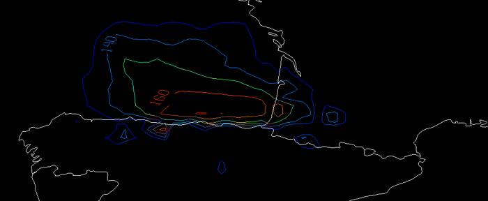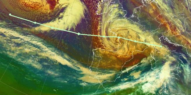 The following 6 hours, the air mass RGB animation shows clearly the fast moving nature of the system, and the nearly zonal path that it followed. Also, we can notice that the cyclone has no remarkable vertical development, compare to other Atlantic cyclones. However, strong thermal contrasts (that will be commented later) and intense descending upper level flow to the rear of the system, can be inferred from some of the images in the loop. These intense upper level descending flow phases, could be associated to the rapidly developing stages in the life cycle of the storm.