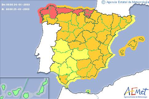 Also, from the forecaster point of view, Klaus effects were properly warned beforehand, as can be seen in AEMET's warning map below. It is not very often that one sees such a wide area covered with red level warnings, mainly for winds and wave heights. Check also that a great part of the map was also filled with orange level warnings.