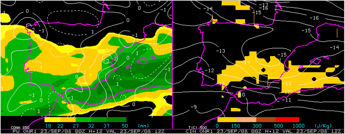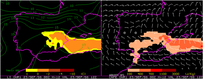 Several parameters for potential bouyancy at 500 mb (LI) and integrated (CAPE) were available at Spanish forecast offices. As an example, here is presented the 12 hours LI and CAPE forecast by 00 UTC high resolution HIRLAM model run (parcel lifted in computations: first 100 mb average). Also shown below, the surface wind field and 850 hpa wet bulb.