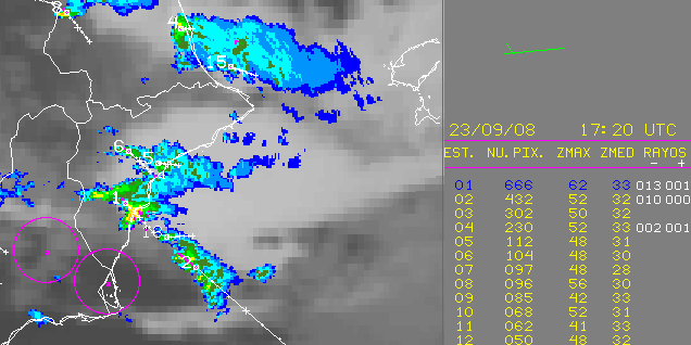 Below a 1 hour radar (PPI reflectivity) + Satellite (MSG/IR 10.8) loop is provided. This product is available in real time to AEMet forecasters. Have a look to the loop and try to answer the questions.