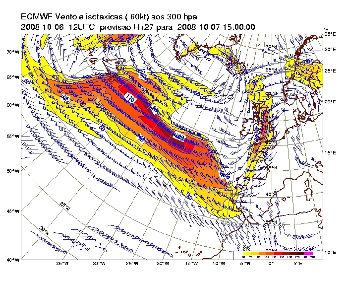 Figure 11: Jet stream at 300 hPa at 15UTC on 7th October 2008. H+27 from ECMWF runs at 12 UTC on 6th October 2008. Wind barbs greater or equal 30 kt and isotachs greater or equal 60 kt.
