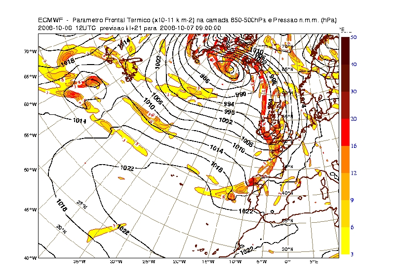 Figure 4: Thermal Frontal Parameter at 9UTC on 7th October 2008. H+21 from ECMWF run at 12 UTC on 6th October 2008.
