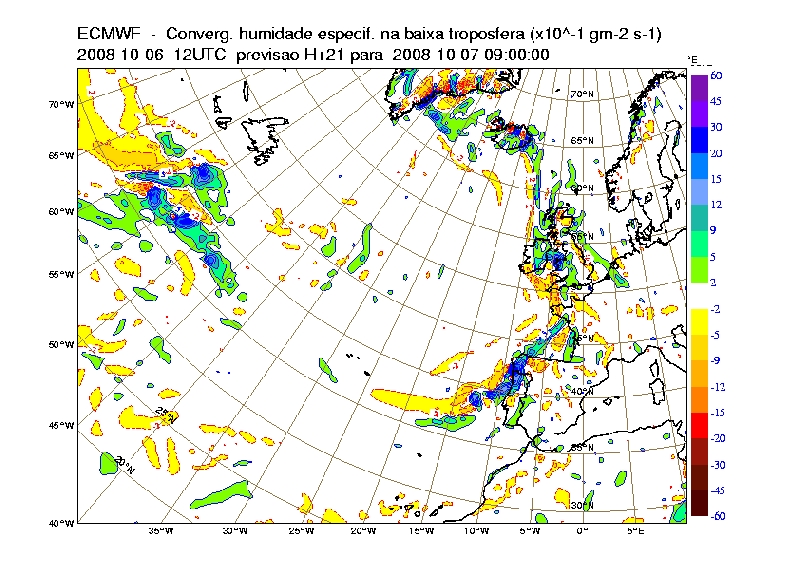 Figure 5: Specific Humidity Convergence in low troposphere at 9UTC on 7th October 2008. H+21 from ECMWF run at 12 UTC on 6th October 2008.