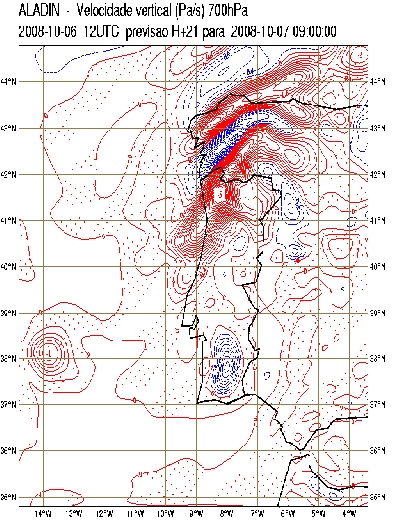 A clear distinction of high convective cells along the cold front and lower stratified cloudiness in the front vicinity is clearly depicted in the HRV RGB (Figure 6), which is reasonably reproduced by the 21 hour forecast of vertical wind at 850 and 700 hPa, for both ECMWF and Aladin models (Figure 7).