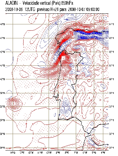 At 9 UTC, during the period of highest frontal activity over northwestern Portugal, the ECMWF thermal frontal parameter (TFP) forecast depicts the cold front a little behind of its actual position (Figure 4). At the same instant, a strong signal in the convergence of specific humidity in lower troposphere is also found over Portugal (Figure 5).