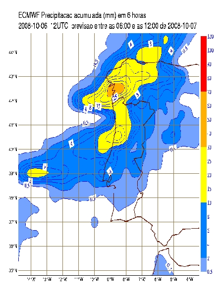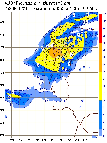 All the parameters above fit the configuration of a typical cold front and, in fact, the precipitation forecast was pretty much inline with the observed values with maximum 6-hour amounts of 30-40 mm in Galicia for ECMWF and 40-50 mm in Northwestern Portugal for Aladin (Figure 8), with a decreasing of precipitation as the cold front moved southeastward along the Peninsula.