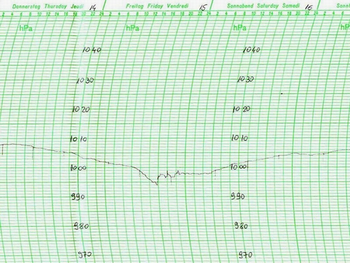 The pressure was falling slowly throughout the day, but then, around 13 UTC it started to fall more rapidly and until 17 UTC it fell for about 5 hPa. Then at 17 UTC it suddenly rose for about 4 hPa.