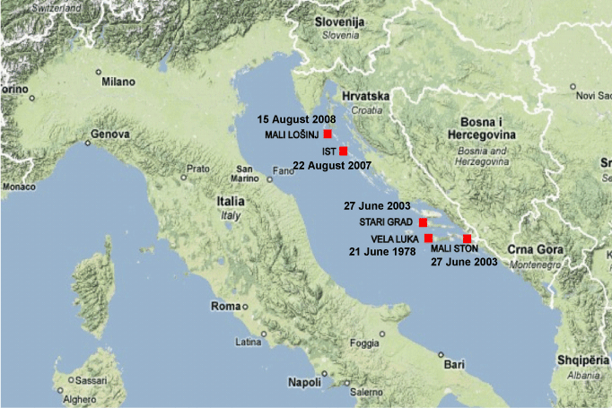 Besides the case of Mali Lošinj there are three more cases known in the Adriatic in the past. They have all been analyzed in details and the analyzes have been published. The image below shows the locations of all known meteotsunami cases in the Adriatic.