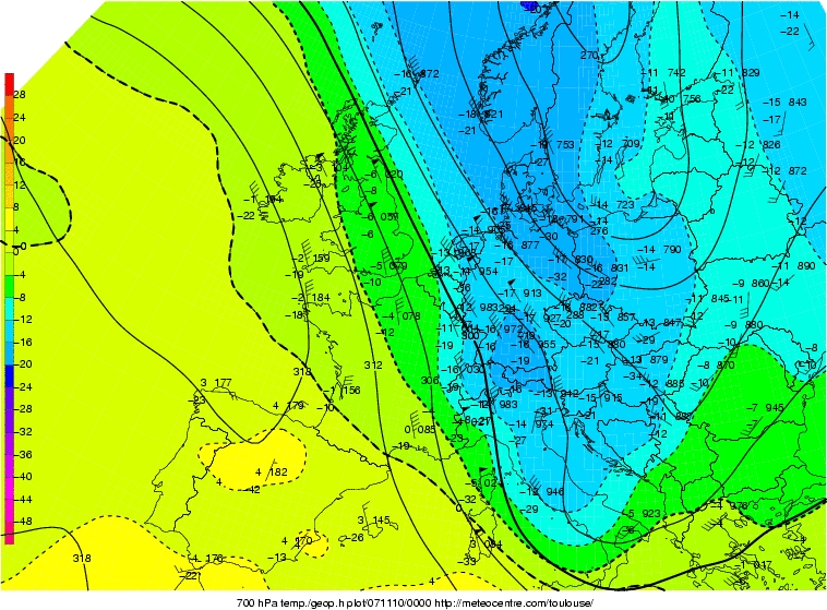 Figure 6: 700 hPa analysis 10 November 2007 0000UTC (meteocentre Toulouse)