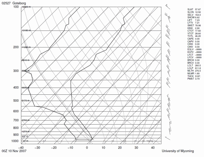 Figure 7: Skew T log P diagram Goteborg 10 November 2007 0000UTC