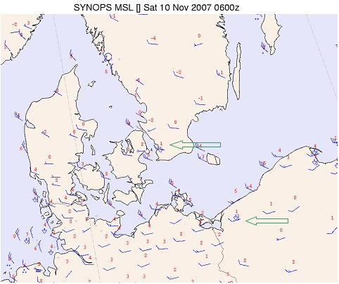 Looking at surface weather reports in detail (fig 8) some special observations attract attention over Kattegat and Sont. At the entrance of the Sont strong wind reports of 25 kt, at the same time much weaker wind from the west or southwest, about 5 kt only, over land. At the exit the surface wind is again increasing to 25 kt. It is understandable the wind speed inside the strait, over water, may reach the reported wind at the entrance and exit or even higher just downstream the entrance due to Venturi effects. The similar effect, stronger winds over sea and weaker over land, is noticeable in the coastal regions of other Danish islands and peninsula, the extreme west part of the Baltic Sea and the north part of Germany.