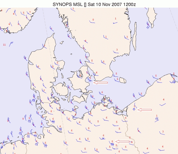 In the previous sections the answers were found for the several reports of snow showers over the Sont and Baltic Sea (fig 3). For the evolution of the weather events it is interesting to have a closer look at the 12.00utc synoptic surface chart in fig 21. Only a few reports of present weather are found in the area: distant showers at the exit of the Sont, actual hail showers just off the northwest coast of Poland (see the red arrows) In fact these two weather reports are betraying a line of showers which is very good depicted in fig 23: the image of the 12.00utc weatherradar, supplied by the Danish Meteorological Institute DMI. It is obvious the line of showers still exists with smaller parts of higher intensity well displayed by the changes in the yellow colour (the darker the more intense).