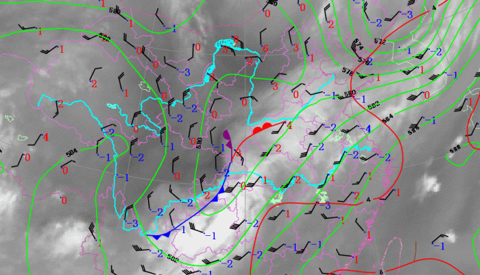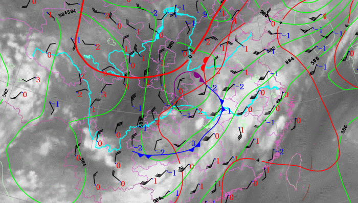 A south-west to north-east cloud band with shallow "S" shape were lied on the front of pressure trough on high level(500hPa). At past 24 hours, atmosphere were been cooler(blue values shown in Figure 5) on the trough rear and almost all of weather station in the south portion of cloud band (white color in WV image). On the other hand, the north portion of cloud band(light grey clouds in WV image) were lied on the north of low pressure center with warmer atmosphere(Red values). So the cloud band were consisted with a cold front and a warm front(the white cloud band on WV image were a cold front and the light grey clouds were warm front). The dark area behind of the cloud band is a occlusion with wind cyclone as figure 5 shown. At the joint of warm front and cold front, a dark strip were existed with cyclonic wind filed and weak warm air advection. So there was a younger occlusion system.