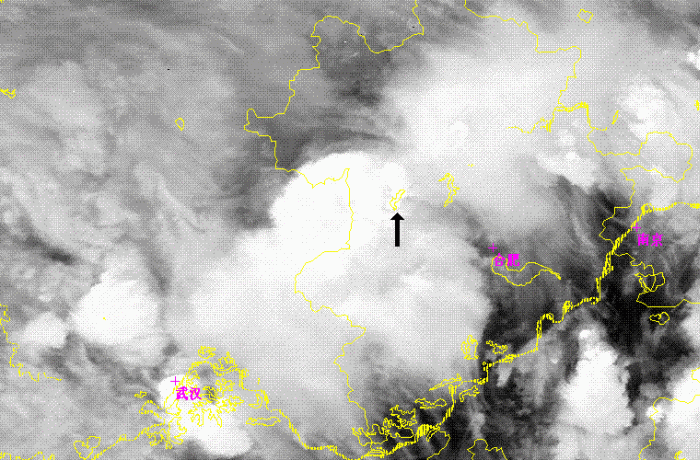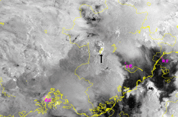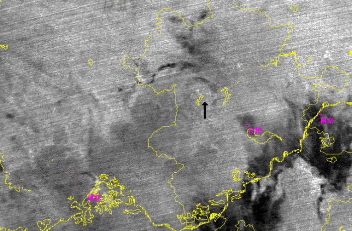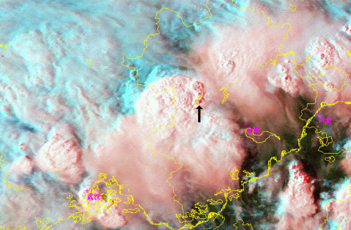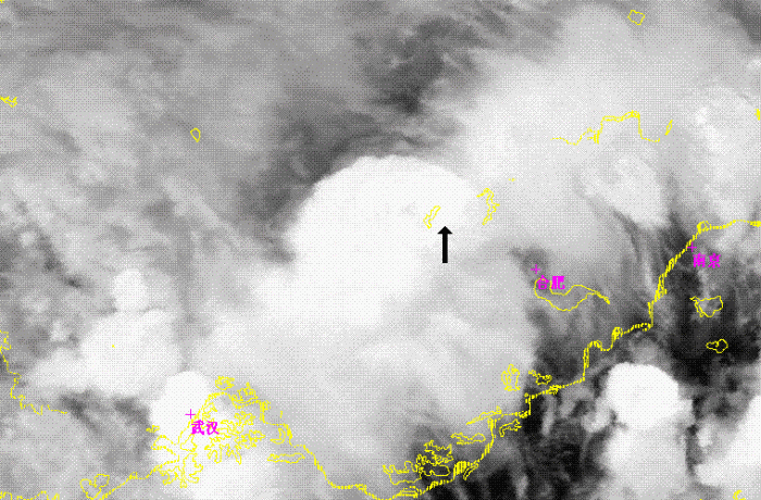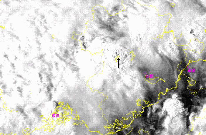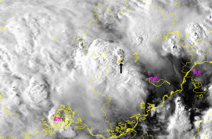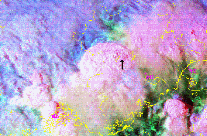 As figure 8 shown, there was a comma shape cloudiness(as black arrow in picture) in a larger convective system at the west of Huaihe River. This comma shape cloudiness were consisted by three small convective cells and were clearly in the channel 1, 3 and Combination images. But the cloudiness were very cold cloud top as a one lager comma shape cloud system, and no any small cells were found in channel 4. In channel 1, several small dark or grey points appeared on the east of 3 convective cells. As it is already 16:00 on local time, so the dark or grey points is the shadows of cloud towns of 3 convective cells, and means the towns were high and steep. At the channel 3 image, ice cloud top as many very white points in image were shown at the center of 3 convective cells. So those 3 concoctive cells were in the developing stage.