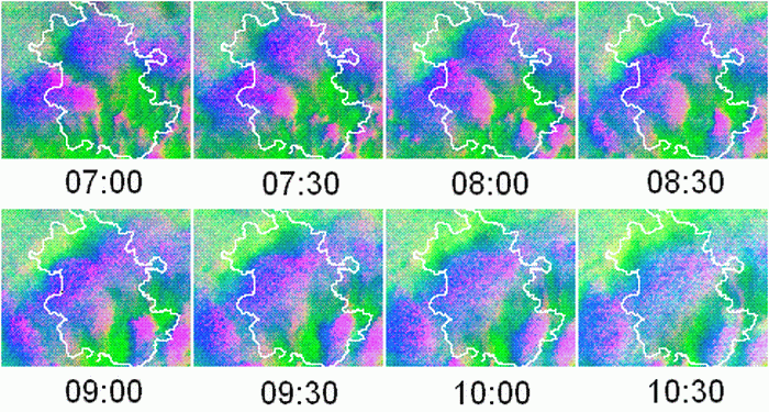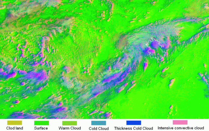 An artificial composite of the infrared and water vapour channels of FY-2 was provided by the RGB combination. The RGB combination consists of the IR12.0-IR10.7 Brightness Temperature Difference (BTD, on red), the IR10.7-IR3.9 BTD (on green) and the IR10.7 channel (on blue). The BTD of IR12.0-IR10.7 and IR10.7-IR3.9 were limited form -4K to 4K, and -90K to -10K respectively. Figure 17 is the RGB combination image and intensive convective cloud could been found easily. But there are a lots noise points in thickness cold cloudiness, just as several disperse pink points lied in the blue region in image. As soon as noise points were appeared, the convective cloud was not intensive any more and maybe die out in the following few hours.