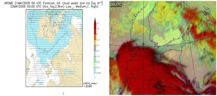 Fig. 5: AROME 00UTC forecast and fog-product from SEVIRI data from 12UTC to 00UTC.