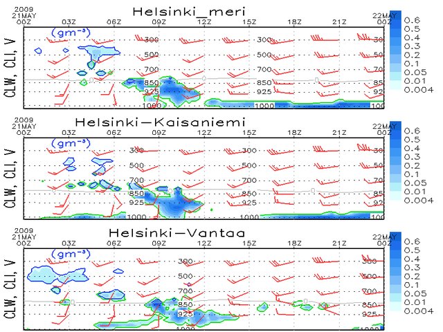 Lastly a meteogram presenting three different locations (Helsinki - ocean, Helsinki - near shore inland and Helsinki - inland ) illustrates again how well AROME performed in modelling the advection inland in the Helsinki region. Blue tones show the amount of cloud condensate (cloud water + cloud ice) in each model layer in units of kg/(m2). The green solid line surrounds the area with cloud water present, whereas the blue line surrounds the cloud ice. The gray solid line is the isotherm of the 0*C. Red arrows show the wind direction and speed on selected model levels. The speed is obtained by summing the barbs, counting a short barb as 2.5 m/s, a long barb as 5 m/s and a triangle as 25 m/s. Numbered dashed isolines indicate the air pressure.