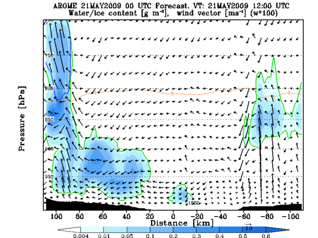 Animation 2: Cross section evolution from AROME 00UTC forecast +12h to +24h. Cross section line presented on the right hand side figure.