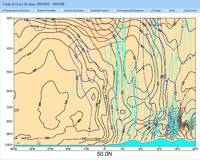 As described before the cold front is situated over Switzerland at 18 UTC. Observing the infrared-picture there are several MCs in front of the cold front. The vertical cross section ranging from the Atlantic coast to Poland also shows the front as well as the MCs. The light blue isolines indicate the upward motion (omega) the blue and red isolines the temperature advection. MCS tend to form at the high thickness gradients, indicated by the thermal front parameter (below).