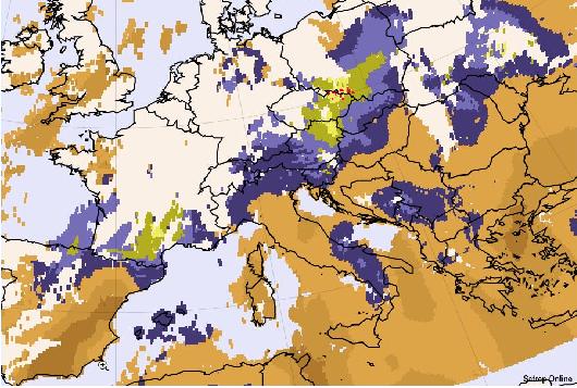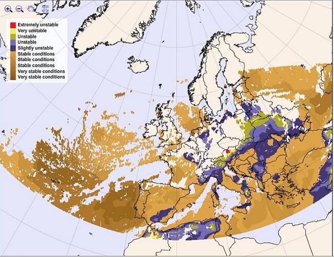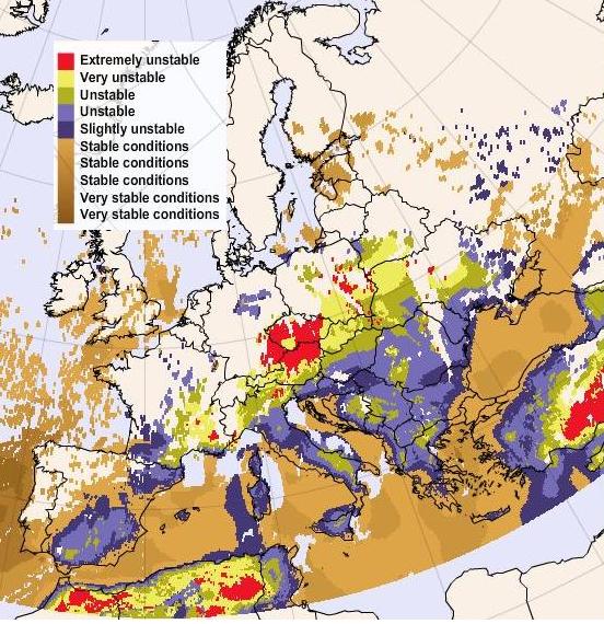6 hours later the situation has slightly changed and there is a very unstable area in the North of lower Austria(yellow area). In the Czech Republic there is a broad unstable zone and in the North you can even detect extremely unstable spots.