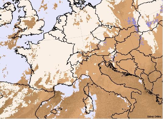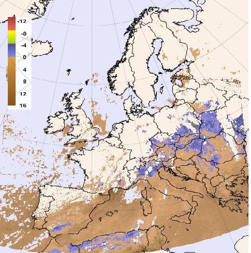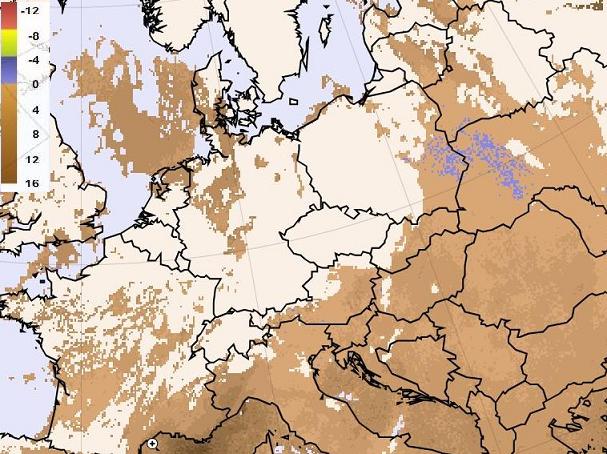 Although the cold front is still situated over Switzerland at 18 UTC, in Austria the zone of unstable stratification has decreased. Here must be mentioned that GII and SAI are calculated using only the Lifted Index. In Contrast the CAPE at 18 UTC shows values about 1650 J/kg. The high potential results especially from the upper level stratification. Besides in many parts of the Austria initial thunderstorms have already released energy. The same situation can be observed in the south regions of the Czech Republic.