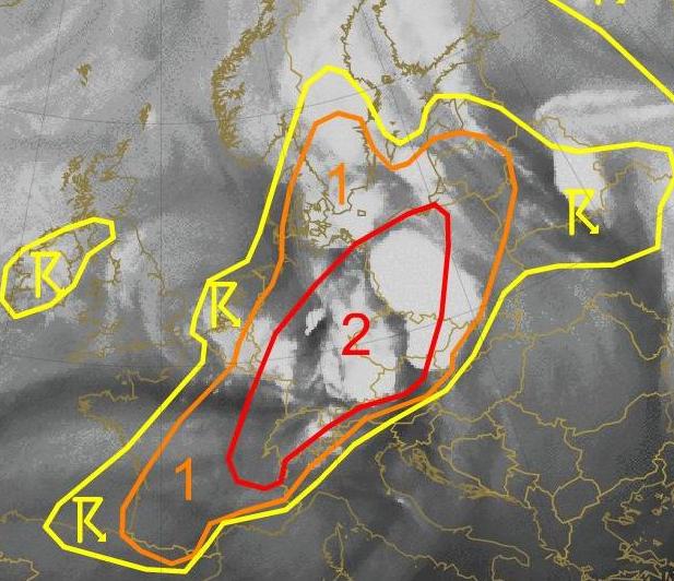 At 12 UTC a level 2 was issued for eastern France, most of Germany, northern Alps, western Poland and Czech mainly for large hail, severe wind gusts and tornadoes. Level 2 corresponds to a probability greater than 15% that a severe convective storm will occur within 40 km radius from a location. This is a significant threat that expresses larger confidence in the occurrence of severe storms. While severe weather phenomena are not part of the criterion, there is a slightly increased probability for these as well (3-5%).