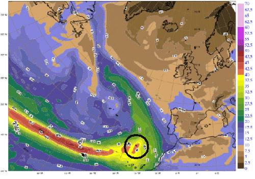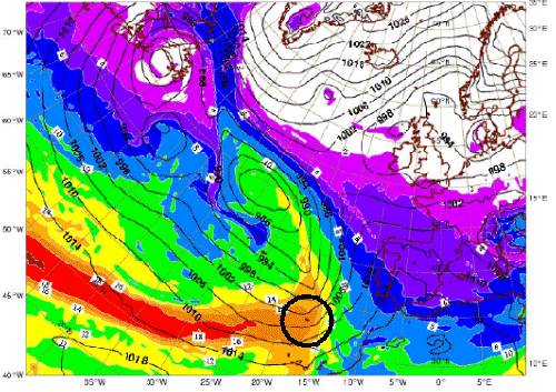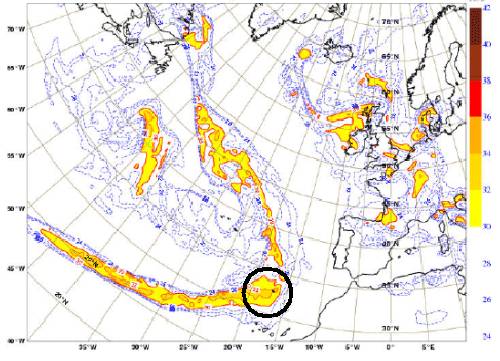 The temperature and dew point vertical profile of Funchal radiosounding confirms that the whole tropospheric layer was very moist up to around 340 hP (Figure 4). The Total Precipitable Water ECMWF analysis shows values in excess of 40 mm close to the island at 12 UTC (Figure 5), which is in close agreement with the radiosounding TPW estimated value of 36.7 mm.