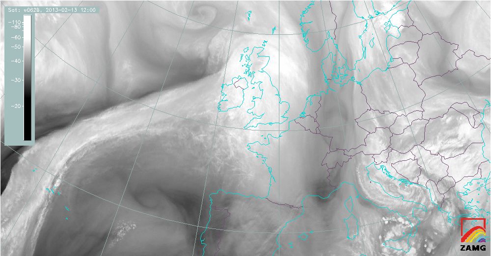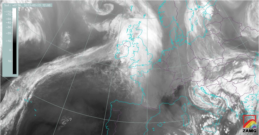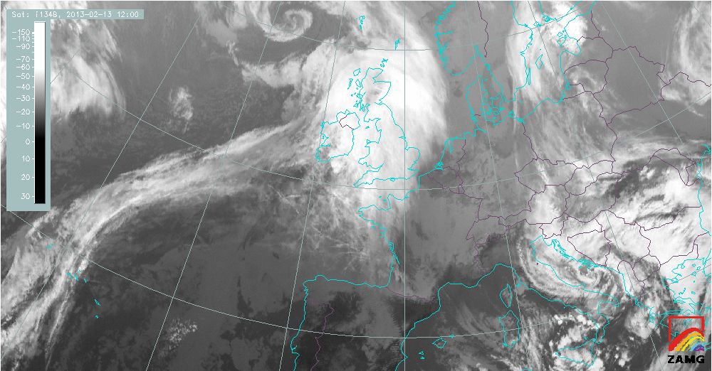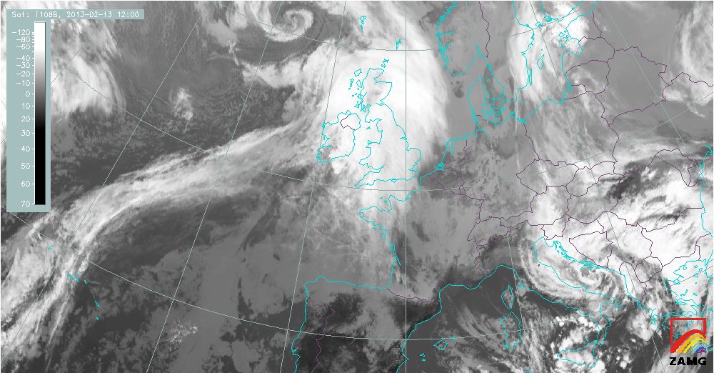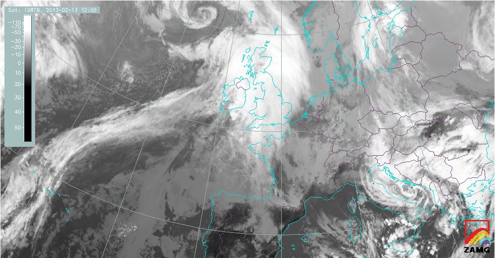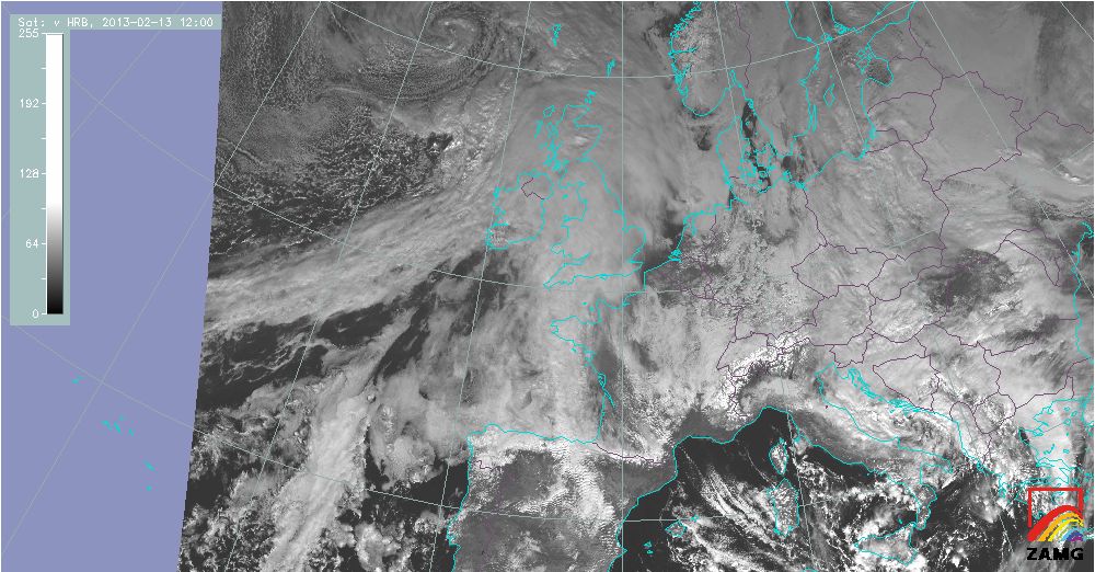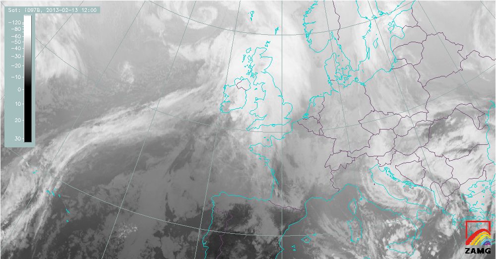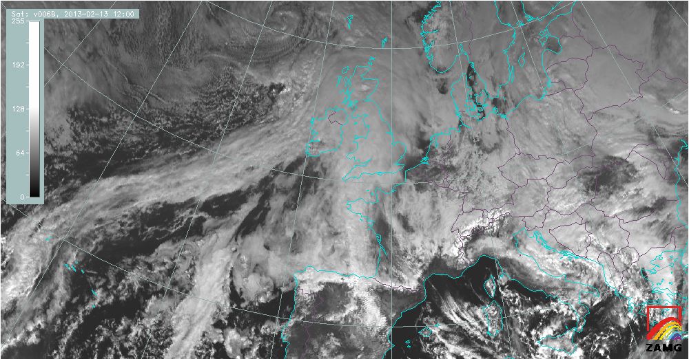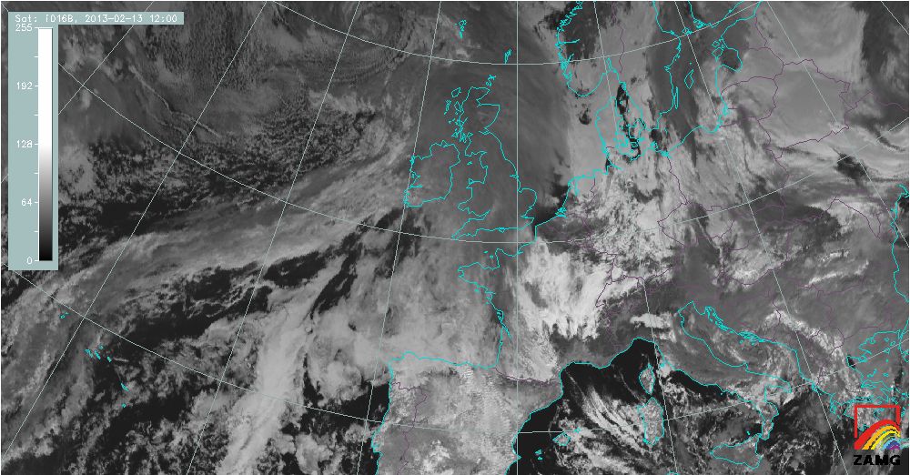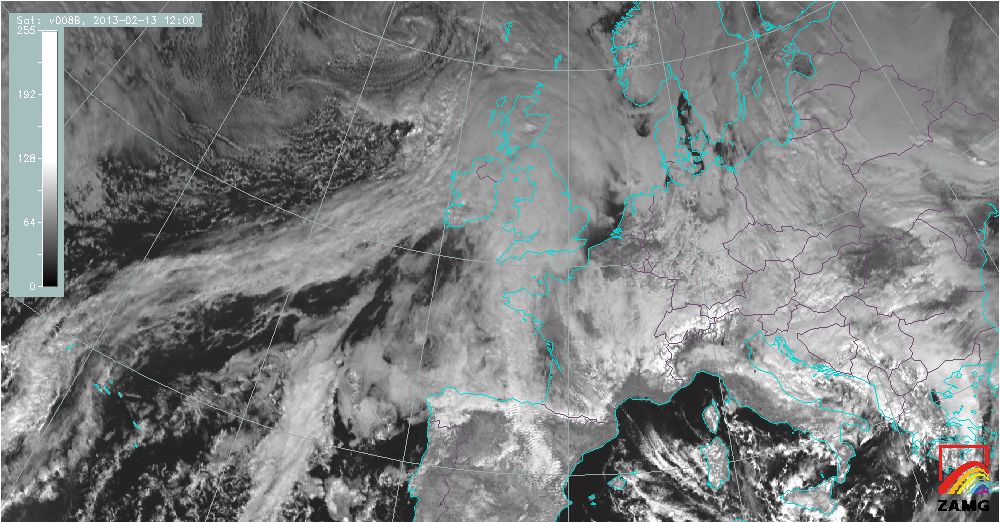 Gray shades represent: Surface/cloud top temperatures; sensitivity to high, thin Cirrus |