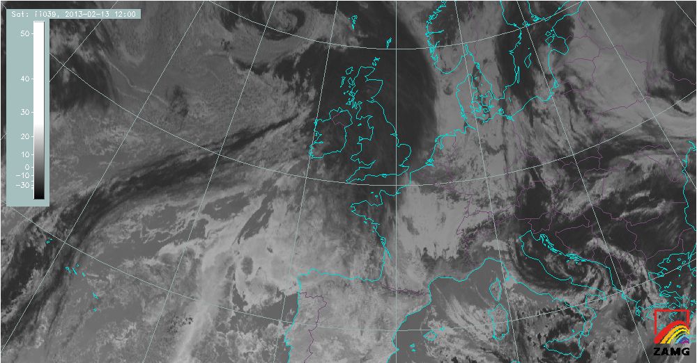 Gray shades represent: Surface/cloud top temperatures; sensitivity to high thin Cirrus |