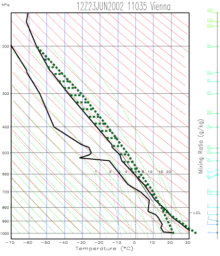 23 June 2002/12.00 UTC - Radiosounding Vienna; black: temperature and dew-point, green: path of a lifted parcel from surface. The area denoted by dashed green lines represents the amount of CAPE.