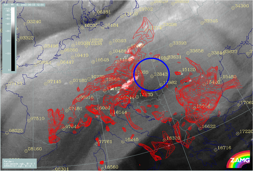 23 June 2002/12.00 UTC - Meteosat WV image; red: Isolines of CAPE >= 600 units/40 units; position of sounding from Budapest (12843) indicated