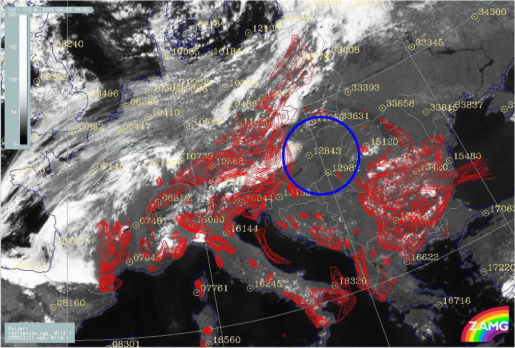 23 June 2002/12.00 UTC - Meteosat VIS image; red: Isolines of CAPE >= 600 units/40 units; position of sounding from Budapest (12843) indicated