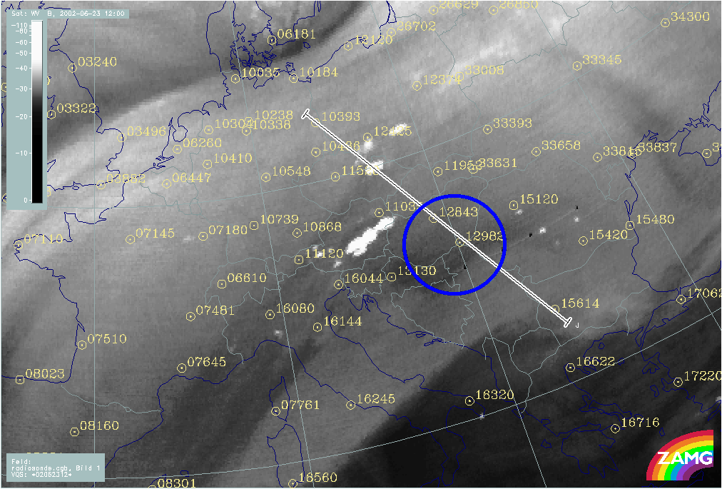 23 June 2002/12.00 UTC - Meteosat WV image; position of vertical cross section and sounding from Budapest (12843) indicated