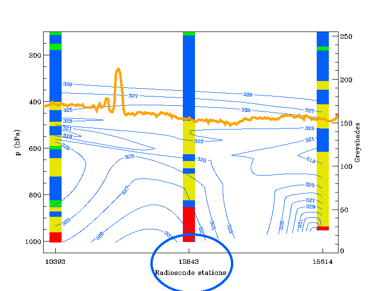 23 June 2002/12.00 UTC - Vertical cross section; blue: equivalent potential temperature, stability analysis, position of sounding from Budapest (12843) indicated