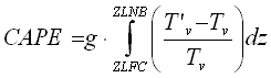 where g= acceleration by gravity, z = height (m), T'v = virtual temperature of the air parcel and Tv = virtual temperature of the environment. CAPE can also be calculated using temperatures instead of virtual temperature. Also pressure coordinates can be used instead of height coordinates.