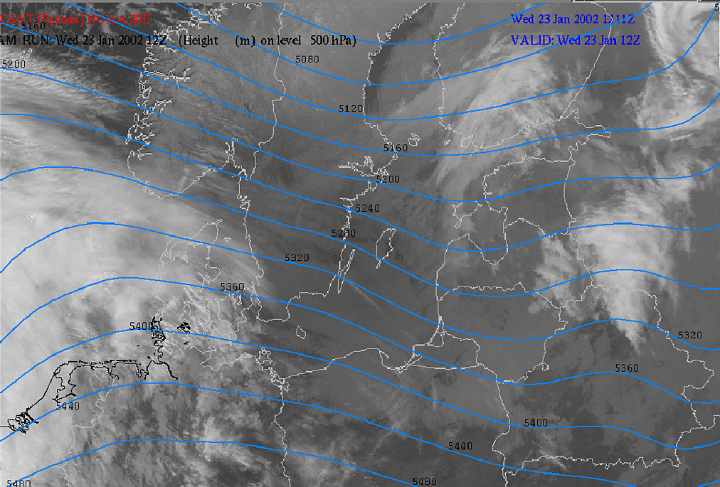 23 January 2002/12.00 UTC - NOAA IR image (channel 4); blue: geopotential height 500 hPa