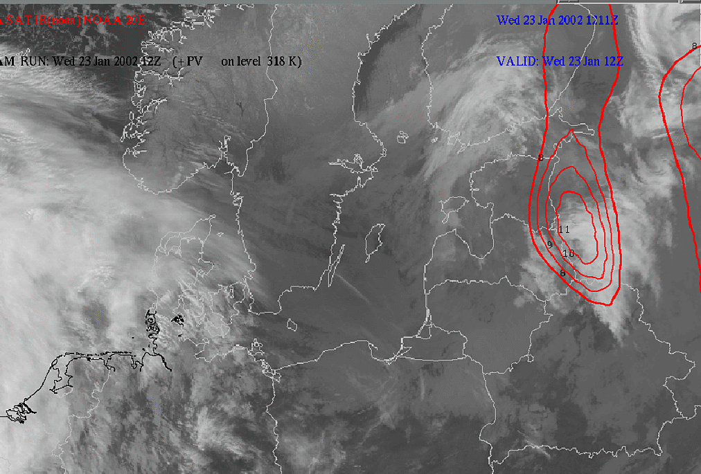 23 January 2002/12.00 UTC - NOAA IR image (channel 4); red: potential vorticity 318K