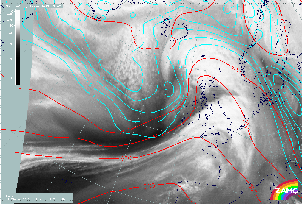 19 February 1997/12.00 UTC - Meteosat WV image; cyan: potential vorticity 306K; red: isobars