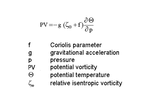 The potential vorticity (PV) is the absolute circulation of an air parcel that is enclosed between two isentropic surfaces. If PV is displayed on a surface of constant potential temperature, then it is officially called IPV (isentropic potential vorticity). Of course, PV could also be displayed on another surface, for example a pressure surface. Note from the relation below, that PV is simply the product of absolute vorticity on an isentropic surface and static stability. So PV consists, in contrast to vorticity on isobaric surfaces, of two factors, a dynamical element and a thermodynamical element.
