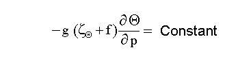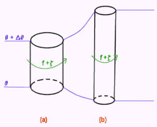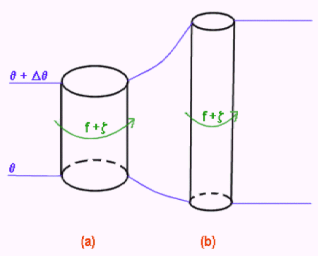 Due to the conservation of PV, there is a close relationship between absolute vorticity and static stability. The diagram below shows a cylinder with the top and bottom defined by two isentropic surfaces. Difference in potential temperature between the top and bottom is the same for the two cylinders. If PV is conserved, and the cylinder is stretched as shown in (b), then static stability is decreasing and absolute vorticity must increase. Alternatively, if one goes from (b) to (a), then static stability is increasing and absolute vorticity must decrease.