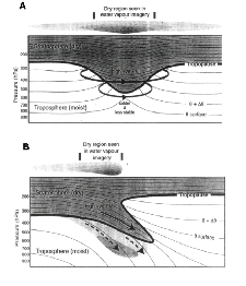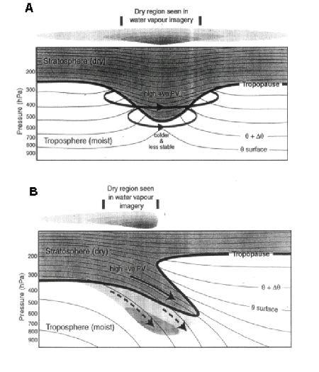 There is a clear relation between PV and water vapour imagery. A low tropopause can be identified in the WV imagery as a dark zone. As a first approximation, the tropopause can be regarded as a layer with high relative humidity, whereas the stratosphere is very dry, with low values of relative humidity. The measured radiation temperature will increase if the tropopause lowers. This is because of the fact that the radiation, which is measured by the satellite, comes as a first approximation from the top of the moist troposphere. High radiation temperatures will result in dark areas in the WV imagery. The upper PV-anomaly and its appearance in the WV imagery can have different shapes, which is illustrated in the schematics below.