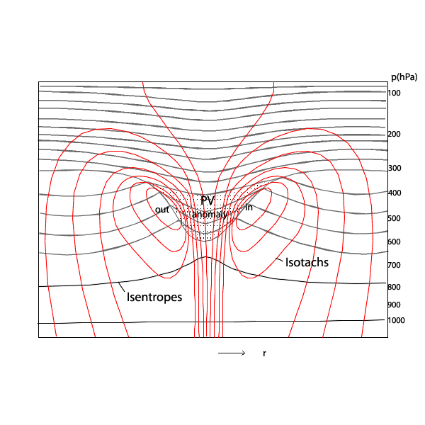 In the previous chapters, it has been mentioned that a lowering of the tropopause is called an upper level PV-anomaly. These anomalies are characterised in the WV imagery as dark shaded areas, which can occur with different shapes. It has also been noted that the PV field induces all other meteorological fields because of the invertibility principle. The characteristics of an upper-level PV anomaly are now examined in more detail. Therefore a cross section through an idealised cyclonic eddy will be examined: