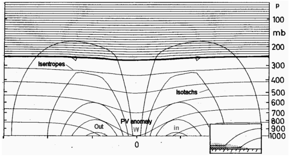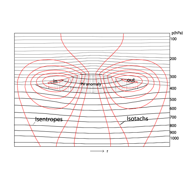 From the diagrams above it can be seen that an upper PV-anomaly is perturbing the wind and pressure fields throughout the whole depth of the troposhere. The effect of the perturbation is proportional to the horizontal scale of the anomaly and inversely proportional to static stability (see the PV equation).