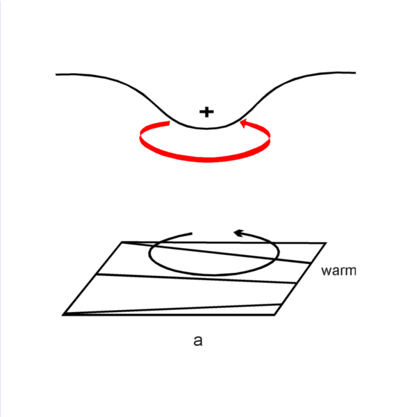 If an upper level PV-anomaly develops, then as a consequence of the PV equation, positive vorticity is released and high PV values from the stratosphere influence the less stable environment of the troposphere. The assumption for the figures above is that that an upper-level, positive PV-anomaly is being advected over a zone of strong, low-level equatorward temperature gradient describes a situation where an originally small-scale upper level trough moves over a zonally oriented surface Cold Front. The left figure (a) shows such a situation with the solid + sign indicating the upper level PV-anomaly.