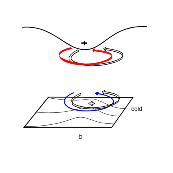 Under the assumption of a three dimensional balance between the fields of mass, pressure and wind, positive PV anomalies are connected with cyclonic vorticity and negative PV anomalies with anticyclonic vorticity.
