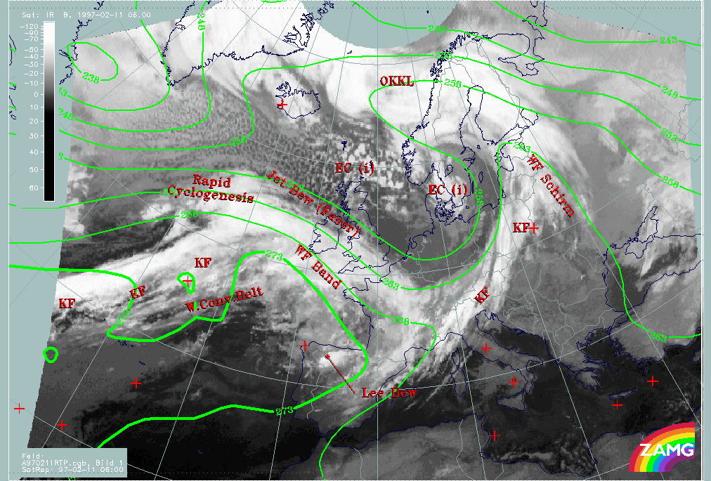 11 February 1997/06.00 UTC - Meteosat IR image; green: equivalent thickness 500/850 hPa, SatRep overlay: names of conceptual models