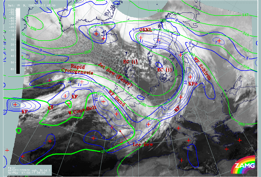 11 February 1997/06.00 UTC - Meteosat IR image; green: equivalent thickness 500/850 hPa, blue: thermal front parameter (TFP) 500/850 hPa, SatRep overlay: names of conceptual models