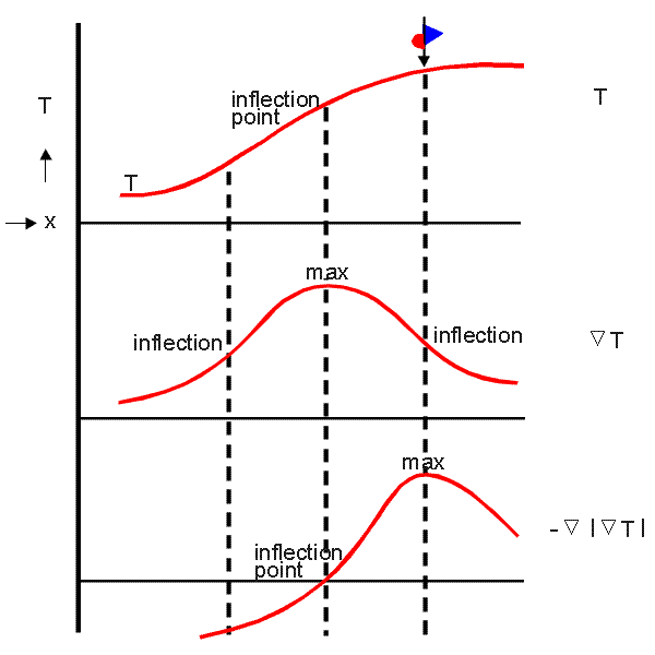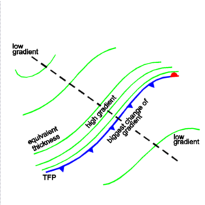 There are relationships between the thickness field and the TFP. As can be seen from the following diagram the maximum of the TFP field which is the location of the front can be found on the warm side of the zones of high thickness gradients because there the change of the thickness gradient is a maximum.