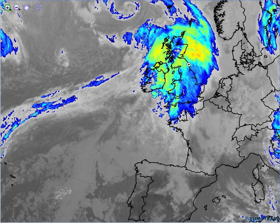 The following example presents the same case as the one that was already used for the basic channels - a winter case. The coldest temperatures can be found in the cloud tops of a warm front shield; the high cloud fibers at the rear of the cold frontal cloud band are also enhanced by the corresponding colors.